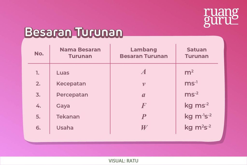 Satuan Turunan (Derived Unit): Satuan yang diperoleh dari kombinasi satuan dasar. Contohnya adalah: